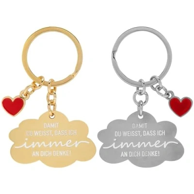 Fun and love ideas: key ring, bag pendant and original accessories in colourful style and with funny text for more fun in everyday life. This pendant set with saying is an eye-catching eye-catcher, a helpful tool for on the go and a loving gift item. Key chain set: Couple key ring motif "Thinking of you", pendant set consisting of two matching key rings, with ring and charm with saying, attached to a designed header card for giving as a gift. TRENDY: Whether llama, sloth, avocado or trendy sayings, colours, shapes and material for a natural, sustainable look - we ensure that the latest trends end up at home, with family, friends and colleagues. @@@LNfqPy3eAGHQC6cshAK+sYd7X6MuONGq@@@ gift idea: suitable for any occasion as a gift, for example for Valentine's Day, anniversary, birthday, Christmas or just as a beautiful souvenir. Suitable as a gift for your girlfriend, boyfriend, mum, dad, partner, for her, for him and all other favourite people. The brand Gruss & Co: Lovingly designed in Germany by our traditional company Sheepworld AG, since 1997 on the Schafhügel in the heart of the Upper Palatinate in Bavaria.