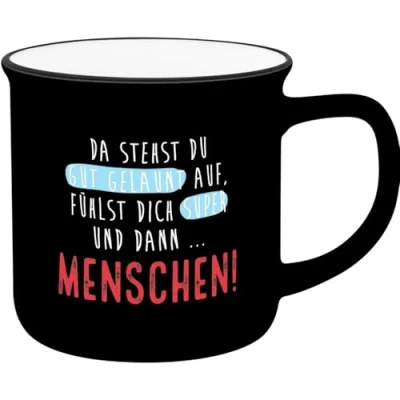 Nostalgic vintage look: mugs, coffee mugs and tea cups in trendy retro design, in enamel look and with loving text. This mug with saying in a trendy nostalgic look brings colour and a breath of fresh air to the laid table, coffee round and office. Mug with saying: mug with coloured motif print and with saying "Menschen", material: new bone china porcelain, volume 35 cl, height 8.4 cm, diameter 9 cm, favourite mug packed in matching designed gift bandols. TRENDY: Whether llama, sloth, unicorn or trendy sayings, colours, shapes and material for a natural, sustainable look - we ensure that the latest trends end up at home, with family, friends and colleagues. Ideal gift idea: suitable for any occasion as a gift, for example for Valentine's Day, anniversary, birthday, @@@3u0VUK2HEADZAEAjMsHscMkZPtHVAGNI@@@ or just as a beautiful souvenir. Suitable as a gift for your girlfriend, boyfriend, mum, dad, partner, for her, for him and all other favourite people. The brand Gruss & Co: Lovingly designed in Germany by our traditional company Sheepworld AG, since 1997 on the Schafhügel in the heart of the Upper Palatinate in Bavaria.