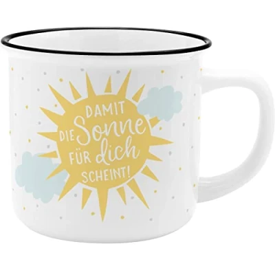 Nostalgic vintage look: mugs, coffee mugs and tea cups in trendy retro design, in enamel look and with loving text. This coffee mug with saying in a trendy nostalgic look brings colour and fresh air to the laid table, coffee round and in the office. Mug with saying: mug with coloured motif print and with saying "Damit die Sonne für dich scheint", material: new bone china porcelain, volume 35 cl, favourite mug packed in matching designed gift bandols. TRENDY: Whether llama, sloth or trendy sayings, colours, shapes and material for a natural, sustainable look – we ensure that the latest trends end up at home, with family, friends and colleagues. Ideal gift: as a gift for family, friends, colleagues, as a thank you, birthday or just as a thoughtful souvenir and as a small surprise. Suitable as a gift for girlfriend, mum, dad, grandma, grandpa, brother, sister and all other favourite people. The brand Gruss & Co: fresh and trendy designed in Germany by our traditional company Sheepworld AG am Schafhügel, since 1997.