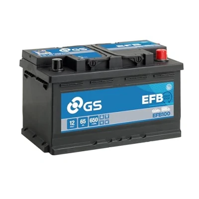 SPECIFICATIONS: 12V EFB High performance Battery; Capacity: 65 Ah; Startup Power (CCA): 650 Amps; Size (mm): 277 x 175 x 175; Weight (kg): 17.6. 270,000 ENGINE STARTS: Built to withstand up to 270,000 engine starts this GS EFB100 battery is designed to keep your start/stop vehicle running smoothly EFB TECHNOLOGY: Enjoy a hassle-free experience with this maintenance-free Enhanced Flooded Battery (EFB), ensuring consistent power and reliability for your vehicle's start-stop systems. DURABLY MADE: With high cyclic durability and Dynamic Charge acceptance for high specification Start/Stop vehicles CONVENIENT FEATURES: Integrated carrying handle for easy transport & installation with flame arrestor technology ensuring safety during use