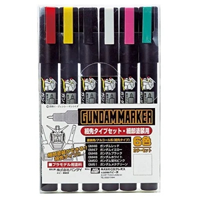 Colors include Gundam Red, Gundam Yellow, Gundam Black, Gundam White, Gundam Fluorescent Pink, and Gundam Metallic Green (tips are approximately 1mm) Set of 6 one mm tipped markers for coloring small parts and hard to reach areas, not intended for panel lines Paint can aso be extracted into a small tray to be handbrushed on