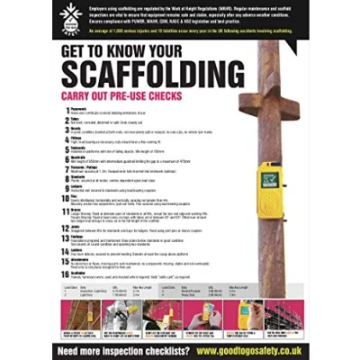 Safety poster highlights required pre-use scaffold inspections and is the ideal accessory to the Good to Go Safety inspection system. Provides a strong visual reminder to employees, showing what they should be looking for during a daily inspection. Produced on tough, durable, wipe-clean synthetic paper this poster is suitable for both internal and external use, making it ideal for displaying in even the harshest of environments. It rolls up for easy storage but won't tear or delaminate – it can be easily positioned using pins, tape, adhesive or poster frames Dimensions 420 x 594mm
