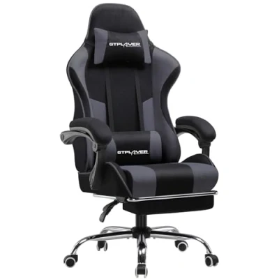 GTPLAYER Fabric Gaming Chair, Massage Ergonomic Computer Chair with Footrest, Lumbar Support, Headrest, Height Adjustable Home Office Reclining PC Racing Chairs, Gray