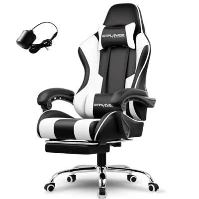 GTPLAYER Gaming Chair, Massage Ergonomic Computer Chair with Footrest and Lumbar Support Height Adjustable 360 Swivel Seat Headrest for Office White