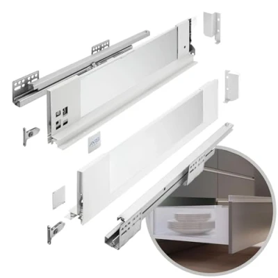 DURABLE CONSTRUCTION AND CERTIFICATION AXIS PRO Glass Side Drawer is built to last and is certified for an impressive 60,000 cycles. Full extension and soft-close mechanism: the full extension is available in lengths from 300 to 550 mm, and the soft-close mechanism ensures quiet operation and smooth closing of the drawer. Tempered glass for durability and easy care: the tempered glass used is resistant to damage and easy to clean. The drawer is designed with glass sides of only 14 mm wide to make the most of the interior of the cabinet. High Load Capacity & Versatile Application The drawer can hold products weighing up to 40 kg. It is suitable for various room management systems, cutlery inserts, mats and waste sorters. Easy assembly and adjustment: The drawer is based on AXIS PRO soft-close rails and offers easy assembly. Adjustment options from the inside, tilt adjustment and horizontal adjustment in the range of +- 2 mm make it easy to adjust. The assembled glass set is prefabricated which makes the carpenter's job easier as no glass cuts are required. The drawer is in anthracite colour and harmonises perfectly with black smoked glass., Manufacturer: GTV