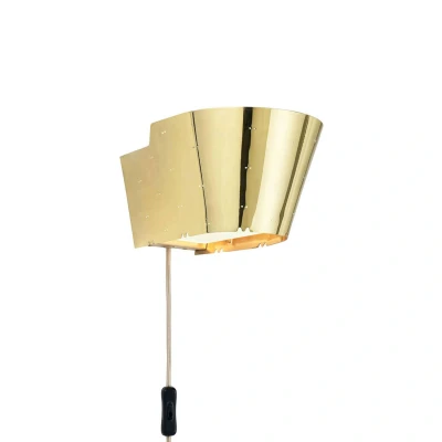 Glamorous designer wall lamp 9464 with decorative two-point hole pattern The wall lamp 9464 was first presented in 1947. It was designed by the Finnish designer Paavo Tynell from Helsinki (1890-1973), who after training as a blacksmith worked for the blacksmith Karu Oy and was trained as a master craftsman at the Helsinki University of Industrial Arts. His wall lamp 9464 fascinates with its elegant brass finish and an atmospheric indirect lighting effect; at the front, the lamp to be inserted is shielded by the metal body, while the underside is partly closed with a satin glass diffuser. The Danish company Gubi redesigned the 9464 wall lamp and manufactures it in the usual excellent quality. - equipped with cable, plug and switch