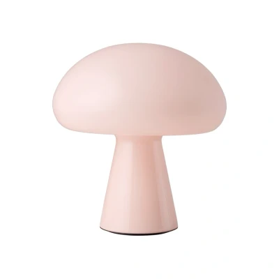 Obello LED rechargeable table lamp made of glass with a lacquer finish The portable, battery-powered Obello LED table lamp by Bill Curry has become an icon of the Gubi collection, embodying the optimism of the Space Age in a mushroom silhouette. The glossy edition in soft powder pink is made of opal, handblown glass and finished with a glossy lacquer finish. A dense array of LEDs illuminates the lamp evenly from the stem to the dome, creating a soft ambience in three brightness levels that can be adjusted via a switch on the lamp base (100%, 40%, 10%, off). The powerful lithium battery provides long-lasting light and can be recharged using the USB-C charging cable supplied. - Can be used both indoors and outdoors thanks to the IP code of 44 - Includes USB-C charging cable without adapter for the power point