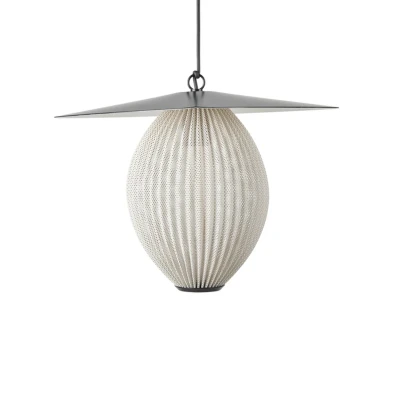 Satellite – timelessly modern designer pendant light for outdoor use by Mathieu Matégot This luminous accessory still looks modern today, even though it was created back in 1953. Its creator, the Hungarian-French designer, architect and artist Mathieu Matégot (1910 - 2001), developed Rigitulle on the basis of perforated sheet metal. This is a thin metal layer perforated in various patterns, which is flexible and can be shaped into the desired form. In the Satellite hanging light, the oval body of the lampshade is made of Rigitulle with a coloured finish, using corrosion-resistant stainless steel. The light from the supplied linear LED bulb, which is protected from moisture in a cylinder, is gently emitted into the surroundings through the fine gaps in the material. Above, a hood painted black at the top and white at the bottom reflects the light diffusely downwards. Power is supplied via a fixed connection. Manufactured in impeccable quality by Danish manufacturer Gubi, the Satellite pendant light is the ideal furnishing element for verandas, terraces and pavilions.