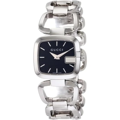 Stainless steel case with a stainless steel bracelet. Fixed stainless steel G-shaped bezel. Black dial with silver-tone hands and stick hour markers. The Gucci name appears below the 12 o'clock position. Dial Type: Analog. Swiss quartz movement. Scratch resistant anti-reflective sapphire crystal. Solid case back. Case diameter: 24 mm. Case thickness: 7 mm. Square case shape. Jewelry clasp. Water resistant at 30 meters / 100 feet. Functions: hours, minutes. Casual watch style.