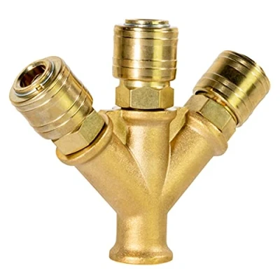 Compressed air connector with 3 x coupling and 1 x plug nipple 3/8 inch connection thread. The distributor is fully assembled. Material: Brass Coupling nominal width 7.2 Couplings are compatible with Güde pneumatic tools 3-way internal thread 3/8 inch, Weight: 0.8377565956 pounds, Manufacturer: Güde