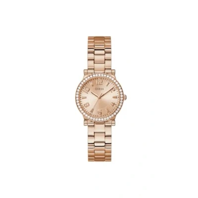Women's watch from Guess, model FAWN Stainless steel rose gold case with mineral glass, case diameter: approx. 32.0 mm (without crown), case height: approx. 7.8 mm, bezel set with stones Stainless steel bracelet rose gold-coloured, folding clasp Rose gold dial The watch comes in a beautiful gift box