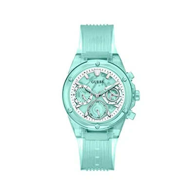 Transparent turquoise 23mm Silicone strap fits up to 7.5-inch wrist circumference Turquoise clear dial reveals internal mechanism; turquoise hands & white accents; full markers Turquoise 39mm polycarbonate case with mineral glass crystal; polycarbonate top ring Multifunction subdials display day, date & 24-hours Water resistant to 30m (100ft): in general, withstands splashes or brief immersion in water, but not suitable for swimming or bathing