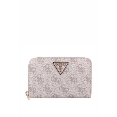 DESIGN — Features the iconic GUESS logo pattern in a chic taupe and white colourway, complemented by gold-coloured logo and zip details for a stylish look. FUNCTIONALITY — Offers four card slots, two side compartments, two bill compartments, and a dedicated coin pocket for optimal organisation of your essentials. COMPACT FORMAT — The medium zip-around design fits comfortably in your hand and can be easily stored in handbags or carried solo. MATERIAL — Made from durable, grained polyurethan with a smooth feel, ensuring longevity and a pleasant touch. GIFT READY — Delivered in an original GUESS gift box, making it an ideal present for special occasions or everyday luxury.