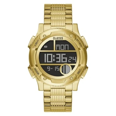 A brushed and polished 3 link bracelet Classic black digital screen Designed with a full stainless steel caseset 44.5MM stainless steel case with mineral glass crystal Water resistant to 50 meters (165 feet): In general, suitable for short periods of recreational swimming, but not diving or snorkeling