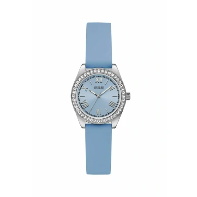 Monochrome look in blue: the GUESS Mini Luna women's watch combines a 30 mm stainless steel case with matching silicone strap and blue dial for a modern, trend-conscious style Compact size with slim profile: with 7.65 mm case height, the women's watch looks elegant and pleasantly light. The 14 mm stainless steel bracelet with folding clasp provides a secure hold up to 190 mm Precise quartz movement: the reliable quartz movement guarantees precise time keeping. Roman indices ensure a classic look and good readability in everyday life Robust mineral glass: the high-quality mineral glass protects the dial from scratches and preserves the intense colour look when worn daily 3 ATM water resistant: with 30 metres water resistance, the watch is protected against rain and splashes of water and ideal for everyday use, office or as a stylish gift idea