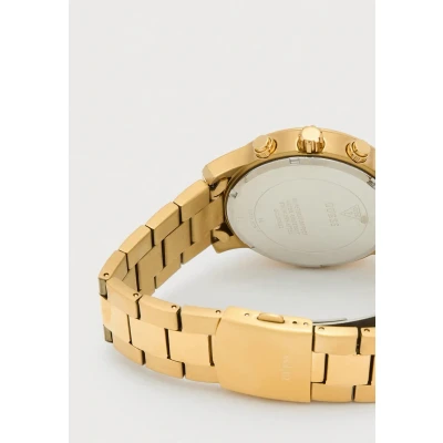The stylish men's watch from GUESS is a real eye-catcher and can be worn with any outfit The high-quality gold-coloured stainless steel bracelet with the folding clasp fits comfortably on the wrist The gold-coloured dial is protected by high-quality plastic glass The stainless steel case has a diameter of 44 mm The watch has a water resistance of 5 bar (suitable for everyday use such as B. bathing, showering or washing hands)