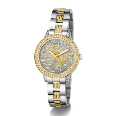 The stylish women's watch from GUESS is a real eye-catcher and can be worn with any outfit The high-quality two-tone stainless steel bracelet with the folding clasp fits comfortably on the wrist The two-tone dial is protected by high-quality mineral glass The stainless steel case has a diameter of 34 mm The watch has a water resistance of 3 bar, it withstands water splashes