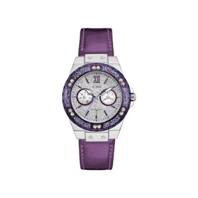 Case material: stainless steel purple/silver with stones Watch strap material: purple leather Dial colour: silver Case diameter: 38 mm Water resistance: 5 bar