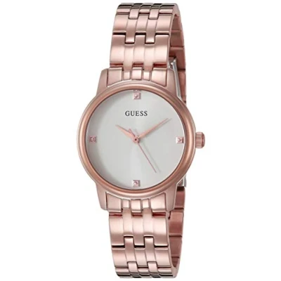 Guess watch W0687L3. Fabulous ladies Guess petite rose gold plated watch that features a white dial face that is beautifully complimented by 4 small cubic zirconia stones to represent the twelve, three, six and nine hour mark on the dial face. The strap is a stainless steel link bracelet with a fold over buckle for closure. Approximate measurements: dial face: 27mm strap width: 15mm strap length: 220mm Lady wafer All Guess watch products are sent in official Guess packaging