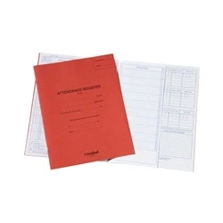 Cutaway pages mean name of pupil only has to be written once. Daily, weekly, monthly and term totals. 50 entries, 3 terms, 5 days Mon-Fri. 70gsm paper and manilla cover. Size: 326 x 205mm. Colour: Red.