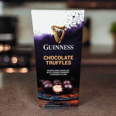 Indulge in the rich harmony of flavours with the Guinness Flavoured Chocolate Truffle Gift Box. This isn't just a box of chocolates; it's a delectable tribute to the iconic Guinness stout, meticulously crafted to tantalize the taste buds of both devoted fans and connoisseurs of fine treats. Officially licensed Guinness merchandise, this gift box unites the essence of the world renowned stout with the world of gourmet chocolate. Packed in a gift box with Guinness branding, the box houses a treasure trove of culinary delight. Each dark chocolate shell cradles a luxurious creamy ganache filling infused with the essence of Guinness, creating an enchanting symphony of taste and texture. As the flavours intermingle on your palate, you're transported to the heart of the brewery, where centuries of craftsmanship meet contemporary culinary finesse. Whether you're seeking an exquisite gift for a fellow Guinness lover or looking to Savor a moment of delight of yourself, this Guiness Flavoured Chocolate Truffle Gift Box is sure to exceed expectation. With each truffle, you're not just savouring a delicacy; you're savouring the craftsmanship, heritage, and unparalleled blend of flavours that make Guiness a timeless classic.