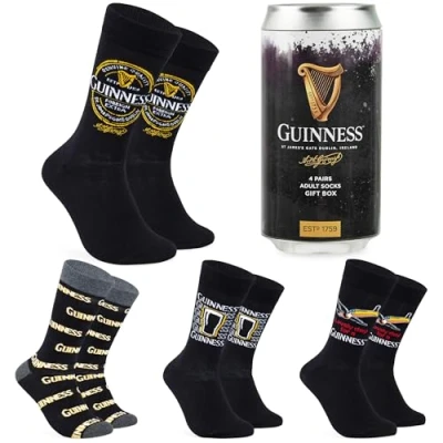 Guinness Men's Socks - The bold and iconic branding makes this pack of 4 Guinness socks a stylish addition to any outfit, perfect for lounging or going out with friends Sizes Available - These mens socks come in one size suitable for men (approx 7-11 UK). The soft, stretchy material offers a comfy, snug fit, making them a versatile wardrobe addition Unique Design & Packaging - These socks for men come in fun novelty packaging that resembles a real Guinness can, adding a quirky touch to your sock drawer or as a gift Official Guinness Merchandise - These breathable socks are officially licensed Guinness gear, featuring durable materials and vibrant designs that true fans of the iconic beer will love Guinness Gifts for Men - Perfect for any occasion, these cool socks make an excellent gift for friends, family, or Guinness fans, with unique design and packaging that’s sure to impress