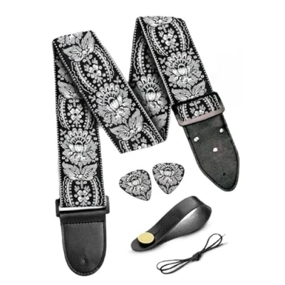 Exceptional durability - rest assured, our guitar strap won't suffer from peeling or cracking over time. Our guitar straps acoustic feature robust cowhide, ensuring longevity and a like-new appearance that endures without flaking or fading, no matter how extensively you use it. Adjustable to your preferred length: feature a user-friendly adjustment system, allowing you to easily customize the length from to your preferred fit. Whether you prefer your instrument high or low, our bass guitar strap accommodates your playing style with precision. Adjusting size between 37" - 64" Length so it's guaranteed to fit you perfectly. men, women & children guitarists Secure locking mechanisms: worry-free performance is ensured with our secure locking mechanisms. Once you've found your desired length, simply lock the acoustic guitar strap into place for a snug and secure fit. No more concerns about slippage or unexpected adjustments during your performance. Unique designs: stand out on stage with our collection of cool, vintage, and floral guitar straps electric. our exclusive line of electric guitar strap - a perfect fusion of style, functionality, and individuality. At the heart of our collection lies a commitment to providing musicians with more than just a means to hold their instrument; we offer a statement piece that enhances their stage presence and amplifies their personal style. Fully equipped gift set It comes with everything a pro guitar player will need including 2 Same Design Picks, Strap Locks & Neck Strap Button for acoustic guitar & classic guitar! This great value package can save you $25 of accessories. Universal cool guitar strap accessories are suitable for all guitars, including acoustic guitar, bass guitar, electric guitar, ukulele, mandolin etc