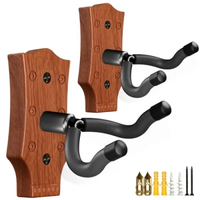 Guitar Wall Mount 2 Pack, Hanger, UShaped Hanger Holder Hook Accessories for Acoustic, Electric Guitar, Bass, Ukulele with 5 Picks (Walnut Color II)
