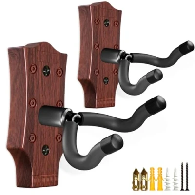 Guitar Wall Mount 2 Pack, Hanger, UShaped Hanger Holder Hook Accessories for Acoustic, Electric Guitar, Bass, Ukulele with 5 Picks (Wood Color II)