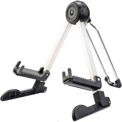 A stand for guitar and electric bass Foldable and portable Adjustable support arms Solid construction made of hardened polyamide and metal Stable triangular construction