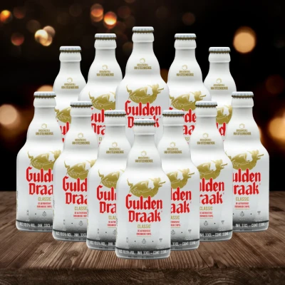 Brewed by the renowned Van Steenberge Brewery, Gulden Draak is a Belgian Strong Ale with a rich history and tradition, hailing from Ertvelde, Belgium. Part of the brewery's celebrated range of Belgian ales, Gulden Draak boasts a dark red-brown appearance and a foamy pale tan head. This beer takes its name from a 900-year-old gilded dragon statue that sits atop Ghent's town square clock tower. It is known for its complex and rich flavours, featuring dark fruit, toffee, bread, and banana aromas, along with notes of alcohol, bubblegum, candied cherry, and coffee. A perfect choice for those who enjoy bold, dark ales with nuanced taste profiles, Gulden Draak pairs well with dishes such as beef, game, smoked meat or fish, and a variety of cheeses including Brie, Gouda, Havarti, Swiss, Blue, and Cheddar.
