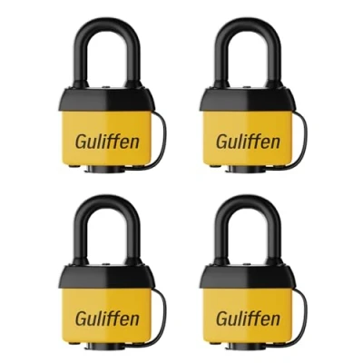 Guliffen’s Laminated Steel key lock has a 1-9/16 in. (40 mm) wide lock body; 1/3 in. (8.5 mm) diameter shackle with 1-1 /5 in. (30 mm) length, 3/4 in. (19 mm) width Locks with keys features heavy duty laminated steel construction and hardened steel shackle for strength and security,4-pin cylinder helps prevent picking Outdoor padlock weatherproof is best used for residential gates, fences, sheds, workshops, garages, tool boxes and more Orange weatherproof resistant thermoplastic shell and silicone waterproof cap provides outdoor protection against moisture, dirt & grime Padlock set: Includes 4pcs keyed alike padlocks , 8 same key, Weight: 1.7747212091 Pounds, Manufacturer: Guliffen