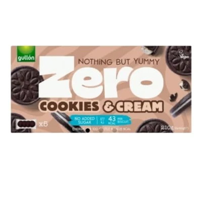 Nothing but yummy Cookies and Cream with No added Sugars Made with High Oleic Sunflower oil and high in fibre Vegan Only 43Kcal per biscuit 1 unit contains 5 portion packs of 4 biscuits