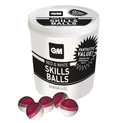 SIZE - Junior. Suitable for children, boys & girls aged 12 and under. Skills Ball Bucket & 24 Skills Balls included. Ball circumference: 8.06 Inch to 8.69 Inch / 20.5 cm to 22 cm GREAT FOR - The GM Skills ball has the same weight and bounce characteristics as a traditional leather cricket ball but without the hardness. With GM's specially formulated core, it is the perfect alternative to a traditional harder cricket ball CORRECT TECHNIQUE - With practice comes better play. Ideal for confidence building by developing correct techniques and skills during cricket practice for both bowling and batting QUALITY - The tough PVC outer material exhibits integrity and longevity during play. The 6 durable raised stitched seams gives the feel of a real leather cricket ball, allowing it to sit in your hand for perfect ball control