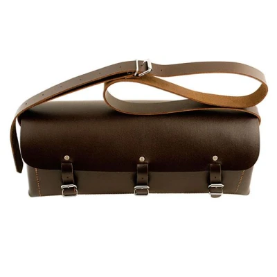 Buckled bag with shoulder strapsClassic style leather tool bagApprox size 150mm x 145mm x 380mmHeavy duty oiled leather with studded trimThree buckle straps plus shoulder strapIdeal for classic car owners