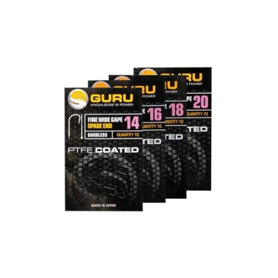Guru Fine Wide Gape Hooks - Contents: 10 pieces - Available in several hook sizes - Bled hook end - Barbless - Fine wire thickness - Very fine and light wire - Ideal for all natural baits - PTFE coating for durable finish - Straight tip for very fast hooking and maximum bite registration The Guru Fine Wide Gape hooks are designed for maximum efficiency when fishing natural baits. Each set contains 10 hooks with a fine wire thickness, where the hooks are strong but extremely subtle. Thanks to the straight tip and PTFE coating, they offer a durable finish, excellent hooking and optimum bite registration, while the lightweight design ensures minimal resistance and natural bait presentation.