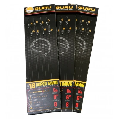 Guru SMWG Banded Ready Rigs - Contents: 8 pieces - Length: 6"/15cm - Available in several varieties - Fish size chart on packaging - Hook with medium wire thickness - Ultra-sharp PTFE-coated hook point - Ideal choice for fishing larger fish - Equipped with a 2mm or 4mm latex bait band - Perfect for hard pellets, corn, meat, boilies and wafters - Suitable for a wide range of commercial rod fishing situations The Guru SMWG Banded Ready Rigs are 15cm ready-made leaders, packed per 8 pieces, and designed for versatility and reliability in commercial fishing. They feature an ultra-sharp PTFE-coated SMWG hook with medium wire thickness, ideal for targeting larger fish. Each rig features a sturdy latex bait tie (2mm or 4mm), perfect for offering hard pellets, corn, meat, mini boilies or wafters. Thanks to the fish size chart on the package, you can easily choose the right variant for your situation. Suitable for feeder, method and fixed stick fishing.