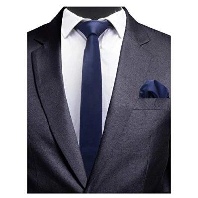 Gusleson 2.4" Slim Necktie and Handkerchief Set For Men Solid Navy Skinny Tie (UK0754 03)