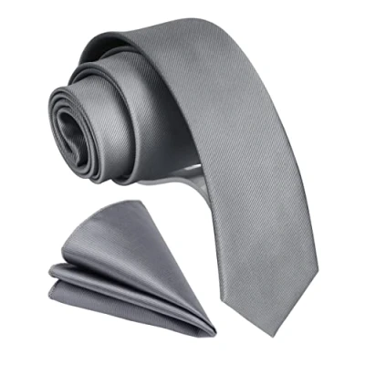 Gusleson 2.4" Solid Silver Tie For Men Dark Gray Slim Skinny Necktie and Pocket Square Set (UK0754 05)