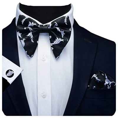 Gusleson Big Silk White Bowtie and Pocket Square Cufflink Flora Adjustable Pre tied Black Bow Tie Set (UK0617 03)