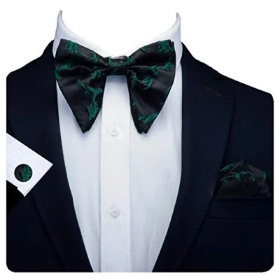 Gusleson Flora Green Bow Ties for Men Pre tied Big Silk Black Tie and Pocket Square Cufflink Set (UK0617 02)