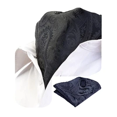 Gusleson Men's Black Ascot Paisley Tie Floral Jacquard Woven Gift Cravat Necktie and Pocket Square Set (UK0603 08)