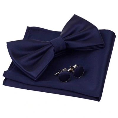 Gusleson Mens Navy Blue Wedding Bow Tie Set Pre tied Bowtie and Pocket Square Cufflink (UK0570 06)