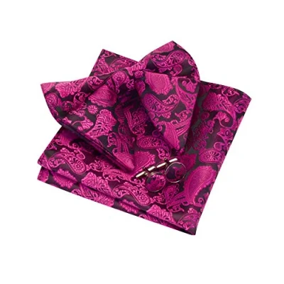 Gusleson Mens Rose Red Bow Tie Paisley Bowtie and Pocket Square Cufflink Set Pre tied Ties for Men Wedding (0613 14)