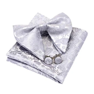 Gusleson Paisley Silk Silver Bow Ties for Men Pre tied Big Bowtie and Pocket Square Cufflink Set (UK0613 04)