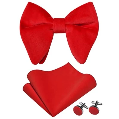 Gusleson Red Big Bow Tie for Wedding Velvet Pre tied Bowtie and Pocket Square Cufflink Sets (UK0571 10)
