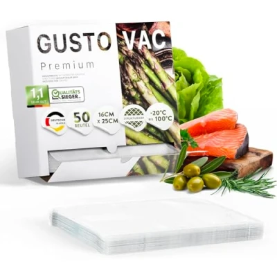 GustoVac Premium Vacuum Bags, Pack of 50, 16 x 25 cm Professional Foil Sealer Bags for Sealers, Boil proof & Sous Vide Freezer Food Sealer, Made in Netherlands