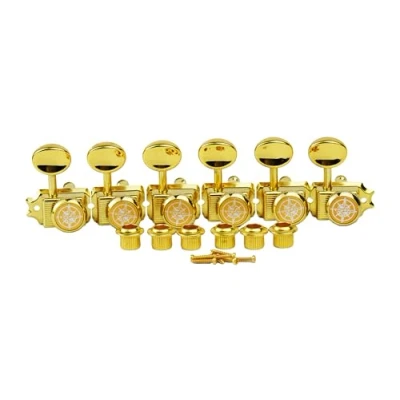 Package includes: 6 pieces (6 right handed) locking guitar tuners pegs, Mounting hardware included. Good replacement compatible with LP, SG, TL Style electric, folk or acoustic guitars. Guitar tuning machines with heavy duty internal gear, sturdy and convenient. Easy to install, easy to replace your old or dirty guitar tuning pegs. Guyker locking tuners help to provide finer tuning and greater stability. Oval shaped button with sealed housing. Golden plated and metal handle. Gear Ratio - 1:15, designed to fit modern 9mm headstock holes. Please check the parameter drawing in the attached pics before placing your order.