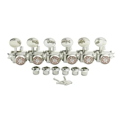 Package includes: 6 pieces (6 Right Hand) locking guitar tuners pegs, 7 mounting screws and 6 threaded bushing, good replacement compatible with LP, SG, TL Style electric, folk or acoustic guitars. Guitar sealed tuning machines with heavy duty internal gear, sturdy and convenient. Easy to install, easy to replace your old or dirty guitar tuning pegs. Guyker locking tuners help to provide finer tuning and greater stability. Oval shaped button with sealed housing. Nickel plated. Gear Ratio - 1:15, designed to fit modern 9mm headstock holes. Please check the parameter drawing in the attached pics before placing your order.