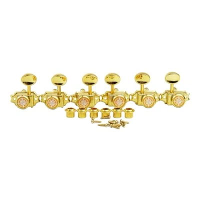 Package includes: 6 pieces (3 for Right, 3 for Left Hand) locking guitar tuners pegs, mounting hardware (screws, bushings and washers) included. Good replacement compatible with LP, SG, TL style electric, folk or acoustic guitars. Guitar sealed tuning machines with heavy duty internal gear, sturdy and convenient. Easy to install, easy to replace your old or dirty guitar tuning pegs. Guyker locking tuners help to provide finer tuning and greater stability. Oval shaped button with sealed housing. Golden plated. Gear Ratio - 1:15, designed to fit modern 9mm headstock holes. Please check the parameter drawing in the attached pics before placing your order.